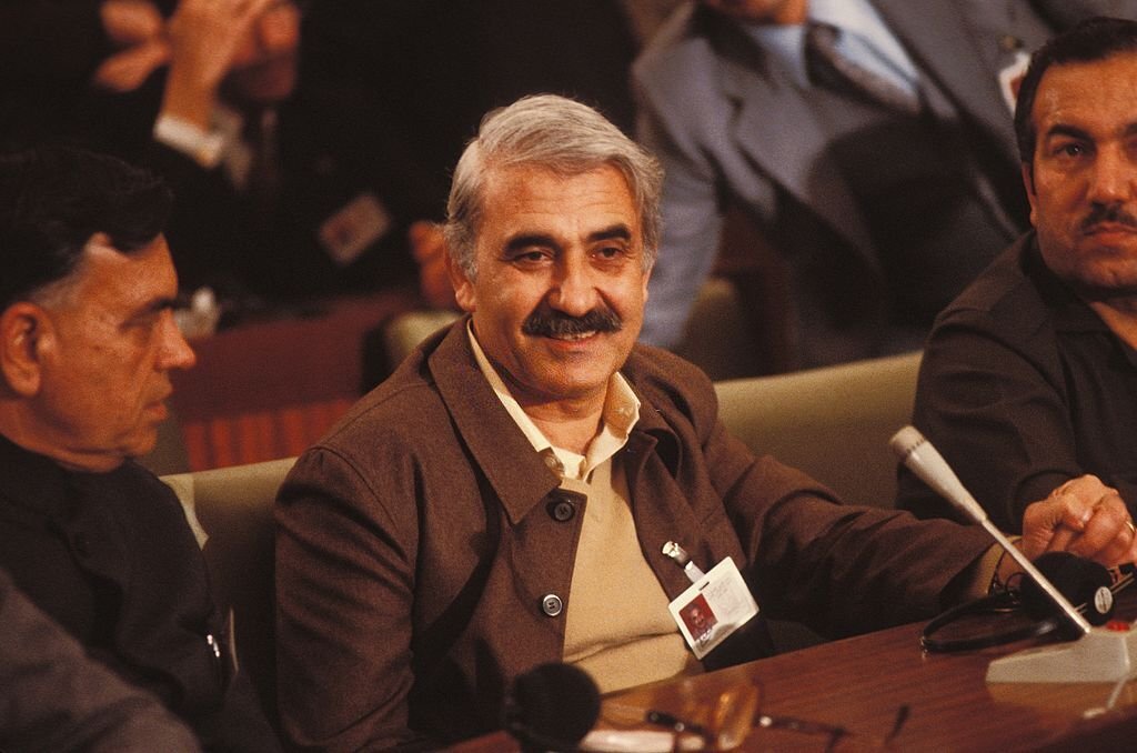 جورج حبش خلال مشاركته في المجلس الوطني الفلسطيني في الجزائر، شباط 1983. (Gamma-Rapho/ Getty Images).