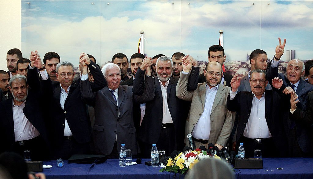 قيادات من حركتي “فتح” و”حماس” يرفعون أياديهم سوياً بعد واحدٍ من لقاءات المصالحة، غزّة، نيسان 2014. (علي جاد الله/ وكالة الأناضول).