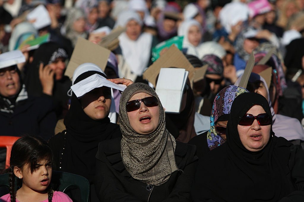 فلسطينيّات مؤيدات لحزب التحرير يرددن شعارات خلال تجمع جماهيري للحزب في رام الله، يوليو/تموز 2007. (عدسة: عباس المومني/AFP).