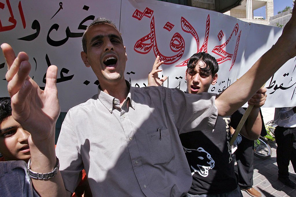 أحد مناصري حزب التحرير يردد الشعارات خلال تظاهرة تطالب بإقامة الخلافة الإسلامية، أغسطس/آب 2007، الخليل. (عدسة: حازم بدر/AFP).
