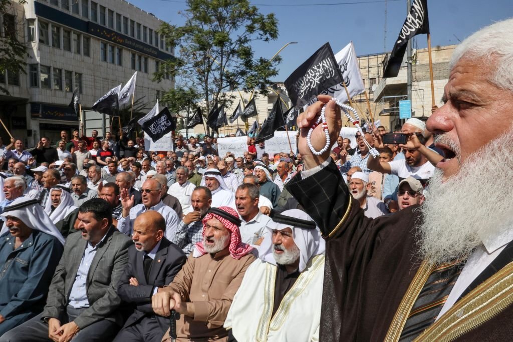 مناصرون لحزب التحرير خلال مظاهرة في مدينة الخليل احتجاجاً على اقتحامات المستوطنين للمسجد الأقصى المبارك، أكتوبر/تشرين الأول 2021. (عدسة: حازم بدر/AFP).