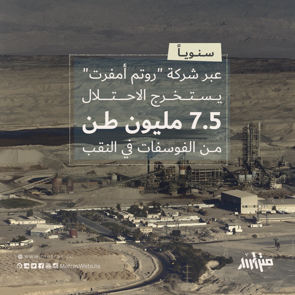 وفي العام 1952، بدأ الاحتلال باستخراج الفوسفات من حقول شمال النقب، لكنّ شركة “روتم أمفرت”، الشركة الأكبر لاستخراج الفوسفات والأكثر ضرراً، أُنشئت سنة 1977 باسم “سماد روتم” كشركةٍ حكوميّة، قبل أن يتغيّر اسمها أواخر الثمانينيات إثر اندماجها مع الشركة الهولندية “أمفرت “، وتتحوّل ملكيّتها في 2001 إلى مجموعة عوفر الخاصّة. وتسيطر “روتم أمفرت” على 60,000 دونم من حقول الفوسفات في الأراضي الفلسطينيّة المحتلّة عام 1948، وهي الشركة الإسرائيليّة الوحيدة التي تقوم باستخراج الفوسفات وتصنيعه، وتبيعه لمصنعٍ آخر يقوم بتصنيع أسمدةٍ متنوّعة، في سوقٍ تُقارب أرباحه السنويّة مليار دولار.