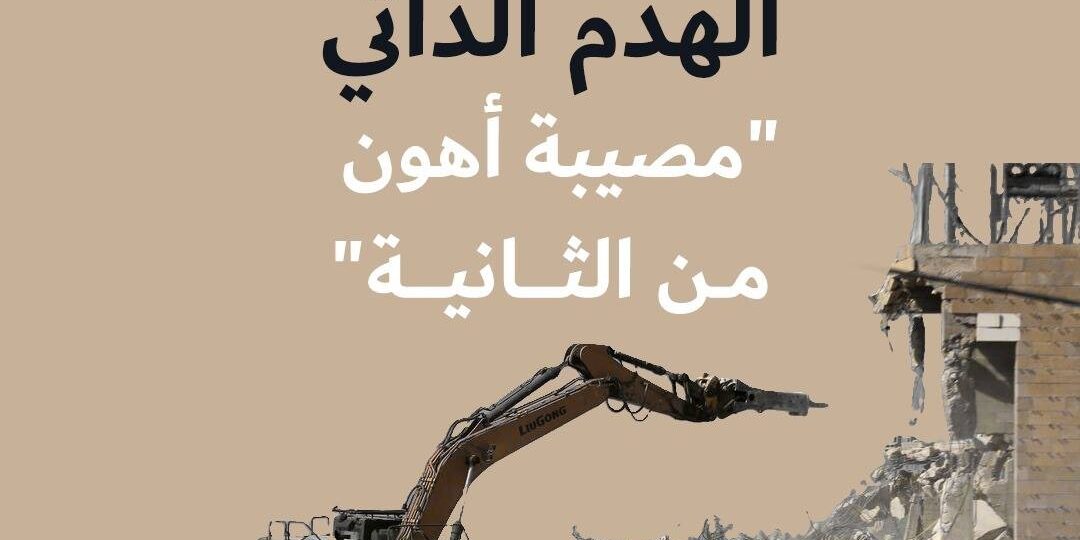 ازداد في الآونة الأخيرة عددُ الفلسطينيّين الذين يهدمون منازلِهم ومنشآتِهم بأيديهم، بعد أن يُصدر الاحتلالُ بحقها أوامر هدم، فيجبرون على مصيبة “الهدم الذاتيّ”، تجنّباً للمصيبة الأكبر بأن يهدم الاحتلال بيتهم ويدفّعهم فوق ذلك أموالاً طائلة.
